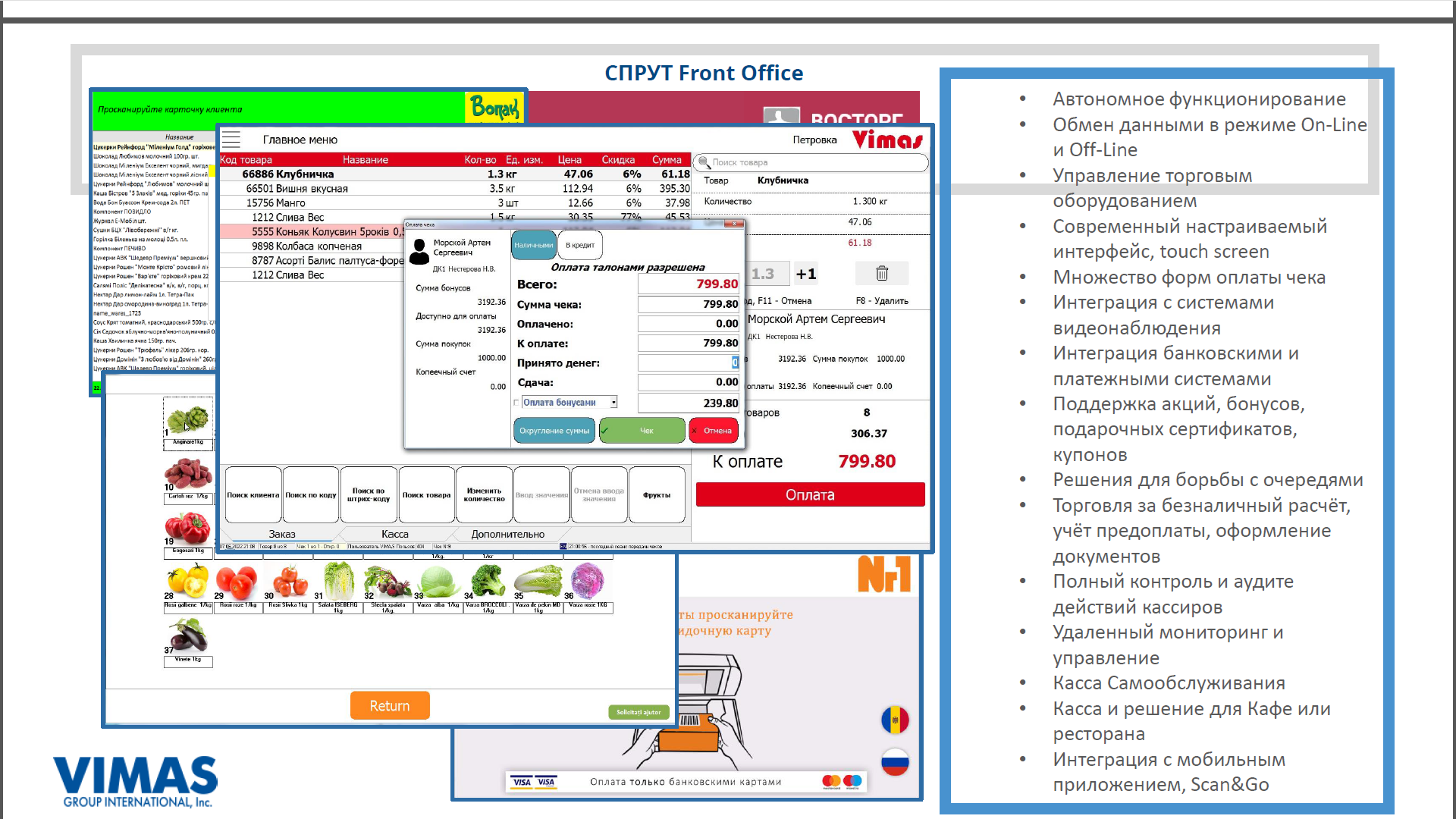 Управление торговым оборудованием множества популярных марок, интеграция с системмами видеонаблюдения, платёжными и банковскими системами.