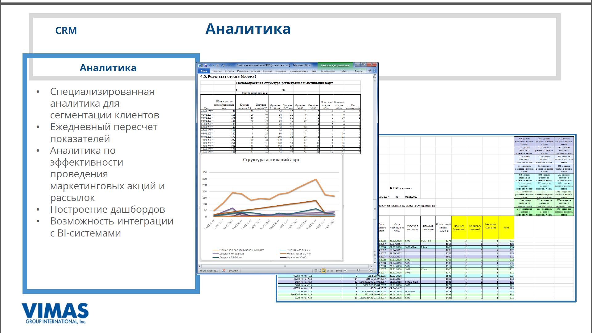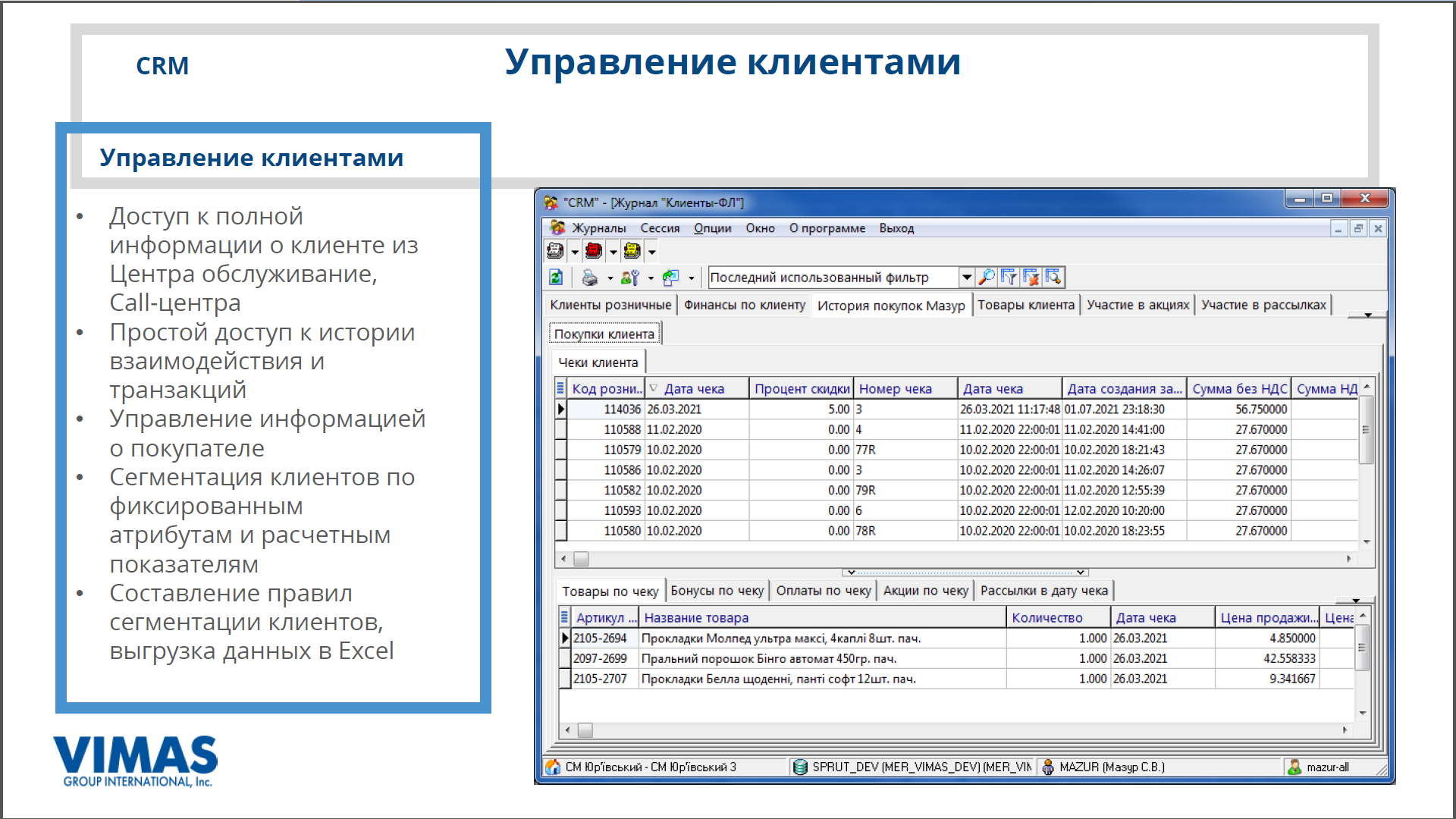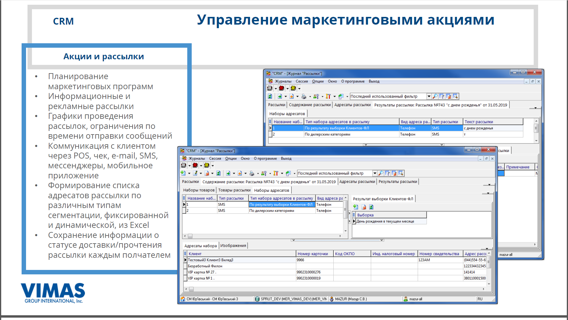 Модуль «CRM» — предназначен для организации доступа через единый интерфейс к большинству регулярных операций по клиентам, маркетингу, аналитике, управлению рассылками и опросами клиентов, оперативной и аналитической информации по клиентам. Ее основное назначение – реализация полного цикла бизнес-процессов по управлению маркетинговой активностью и взаимоотношениями с клиентами на базе стандартных механизмов ПС СПРУТ (BackOffice + FrontOffice) и развитие платформы ПС СПРУТ для реализации web-решений (встраивание в корпоративный портал, личный кабинет клиента, менеджера, и т.д.…). Реализация такой функциональности отвечает современным тенденциям развития задач автоматизации подсистем лояльности клиентов, что в свою очередь повышает конкурентоспособность и доходность торговых сетей за счет устойчивого роста лояльности клиентов.